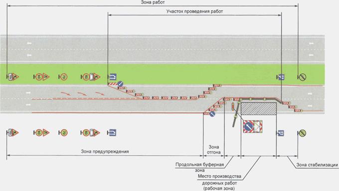 3.6 зона работ: Участок дороги, на котором введено временное изменение организации дорожного движения, включающий в себя следующие составляющие: зону предупреждения, зону отгона, буферную зону, зону стабилизации, а также собственно место производства работ.