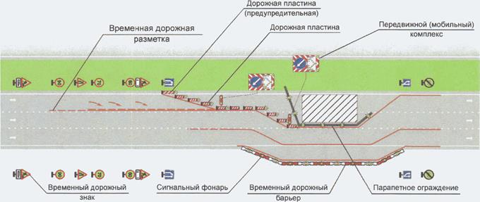 3.1 временные технические средства организации дорожного движения: Комплекс устройств, применяемых на дорогах для обеспечения безопасности дорожного движения и повышения пропускной способности дороги в течение периода, вызвавшего необходимость временного изменения организации дорожного движения.
