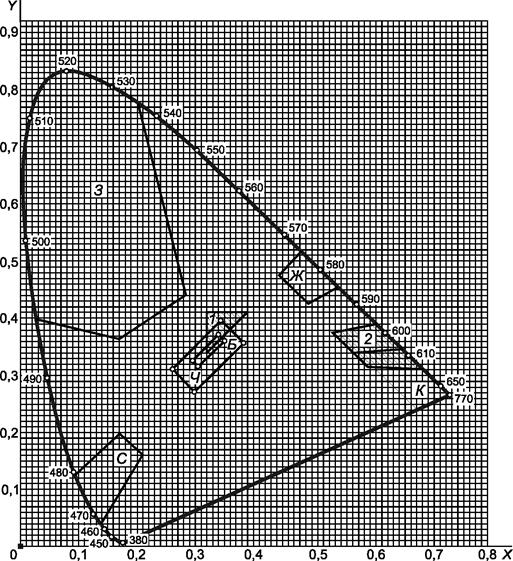 | Красный красно-оранжевый) | x | 0,690 | 0,595 | 0,535 | 0,610 |