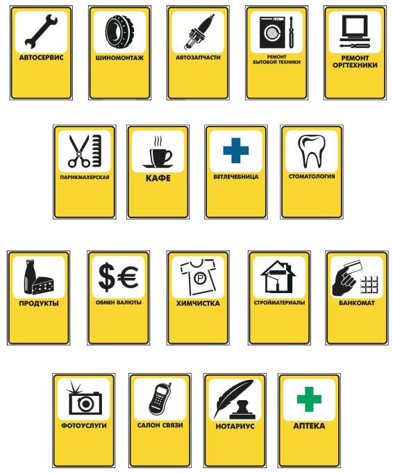 Допустимые пиктограммы и примеры надписей для знаков информирования об объектах притяжения