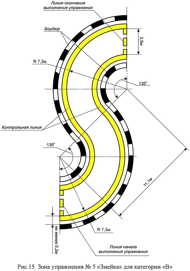 Кандидат в водители должен не более чем за 2 минуты проехать участок дороги с левым и правым поворотами, не наезжая колесом на контрольные линии. При несоблюдении условий выполнения упражнения начисляются штрафные баллы в соответствии с контрольной таблицей № 5.