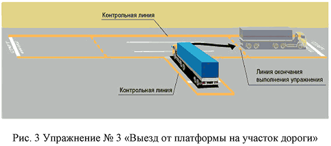 При выполнении упражнения кандидат в водители должен, не наезжая колесом на контрольные линии, осуществить выезд из "габаритного коридора" имитатора погрузочной платформы в противоположном направлении въезда в него и остановить ТС не далее 1 метра до линии "СТАРТ-ФИНИШ", не пересекая ее. При несоблюдении условий выполнения упражнения начисляются штрафные баллы в соответствии с контрольной таблицей № 3.